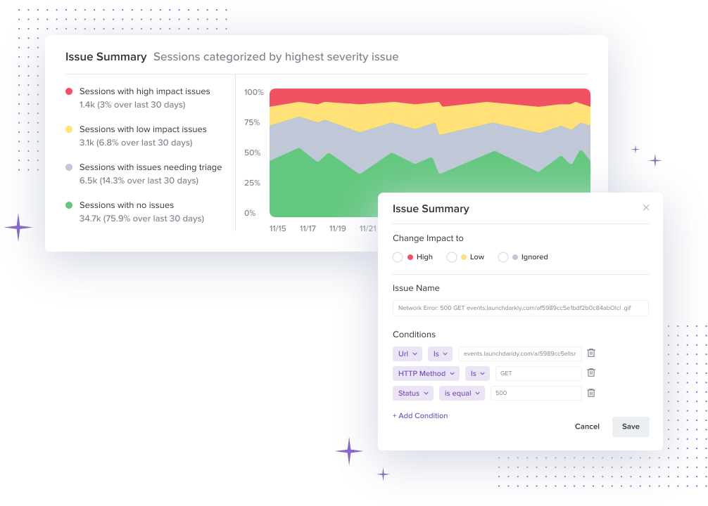 With all this data, you can easily collaborate across teams to determine whether a bug is worth fixing and ship a solution faster than ever. Find JavaScript errors impacting your goals, watch user sessions to understand and quantify how those issues affect your app’s UX, then route alerts and errors to the right person or team for a fix.
